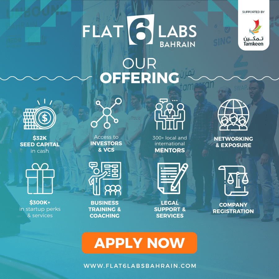 Flat6Labs Bahrain is a startup accelerator operating in the Middle East and North Africa region with locations in Egypt, Saudi Arabia, UAE, Lebanon, Tunisia, Bahrain, and soon, Morocco. The aim of Flat6Labs is to accelerate and launch both local and international startups in Bahrain.